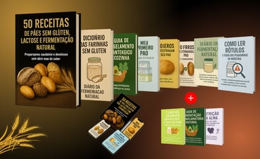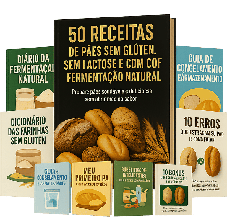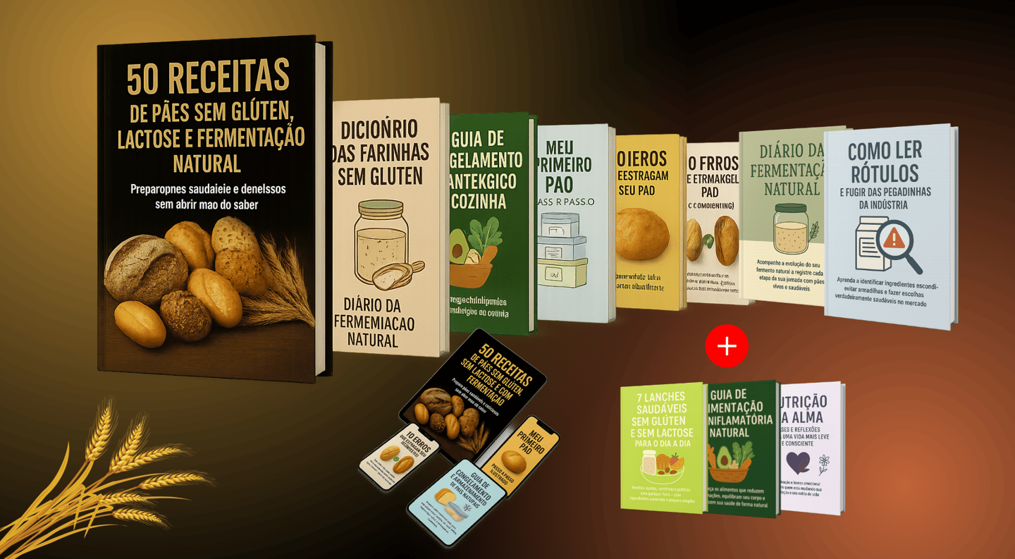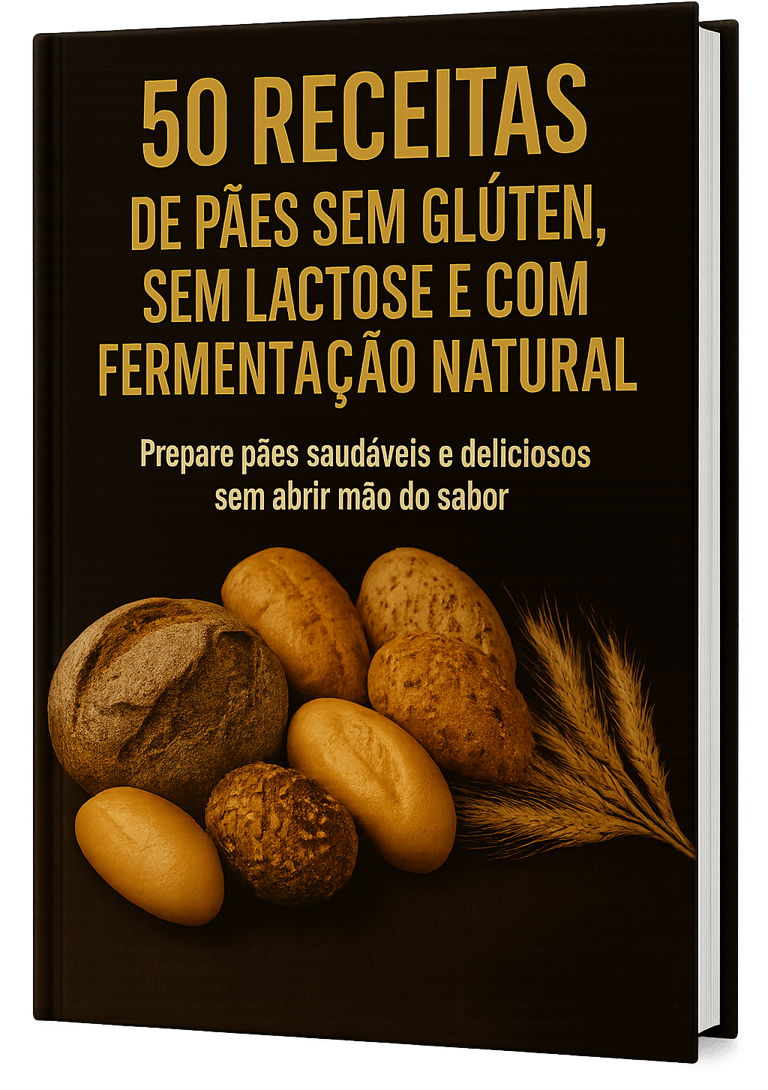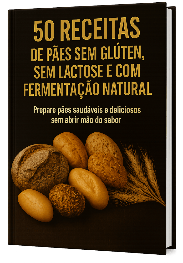 Descubra 50 receitas exclusivas de pães sem glúten, sem lactose e com fermentação natural — macios, deliciosos e tão simples que você pode fazer hoje mesmo, com o que tem em casa.